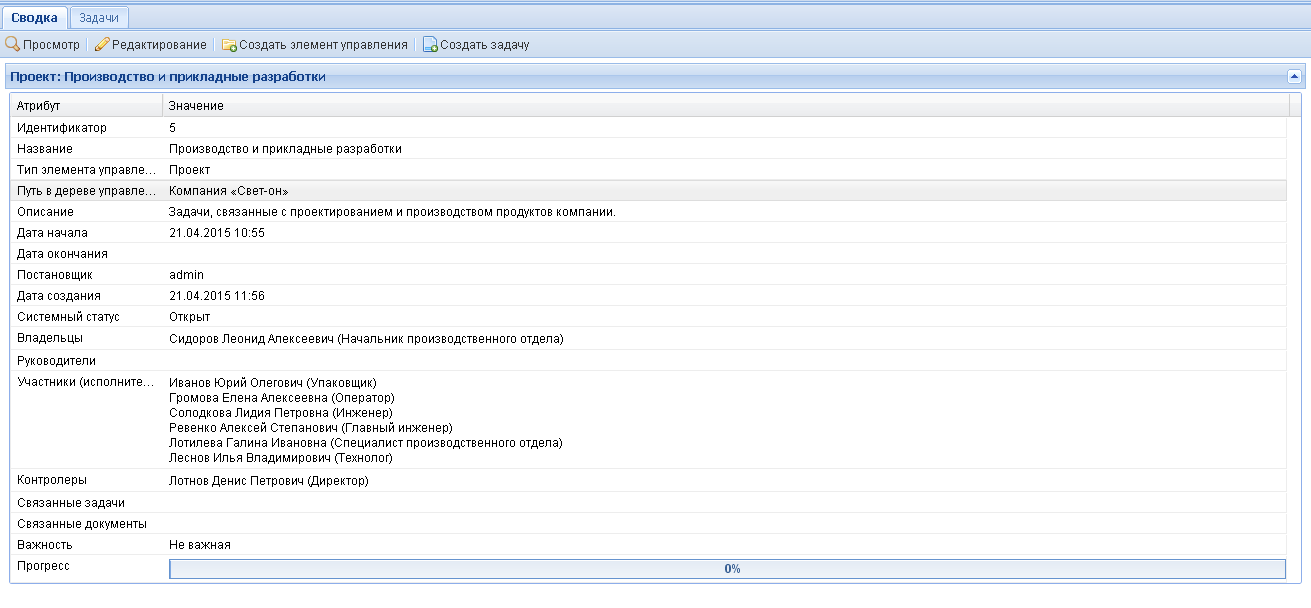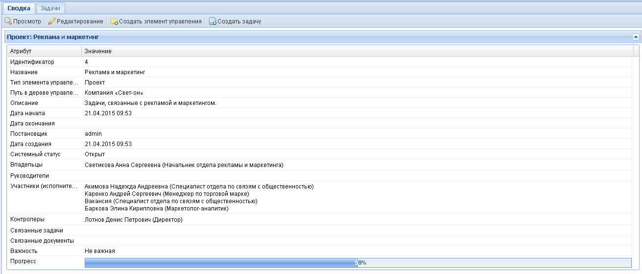 Функционал управления проектами и задачами включает в себя понятие «карточка проекта» – это документ с подробным описанием проекта и перечнем задач, выполняющихся в рамках проекта. Карточку проекта создаёт и заполняет руководитель, определяя список задач, исполнителей, даты начала и окончания проекта.