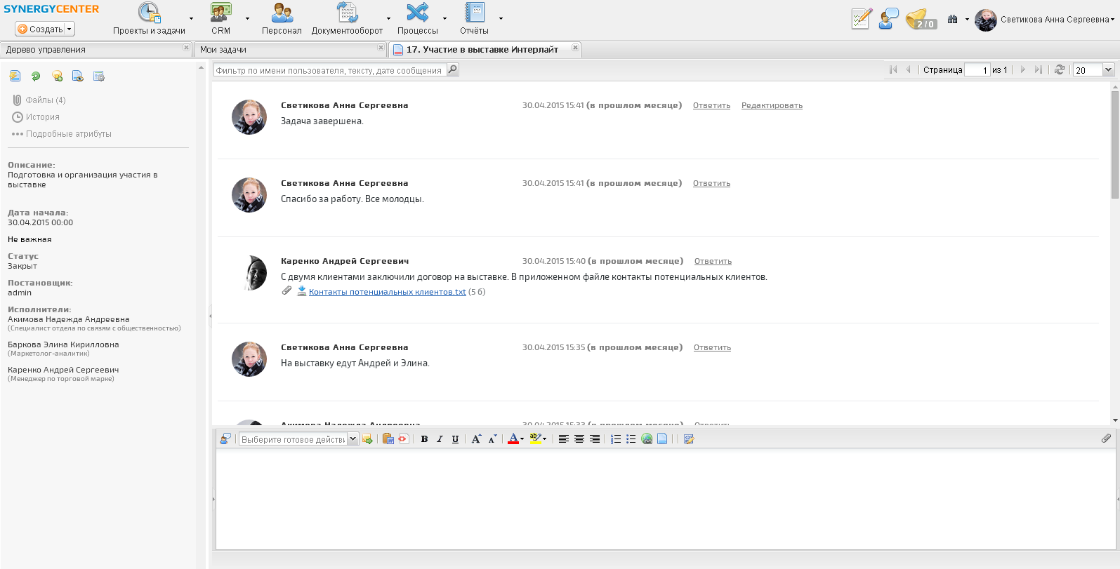 Кроме того, совместная работа в системе электронного документооборота и управления деятельностью компании позволит каждому сотруднику оперативней решать вопросы, появляющиеся в ходе выполнения поручения, ведь возникший вопрос или проблему можно обсудить в системе, для этого не нужно ждать, когда освободится начальник и будет готов вас принять.